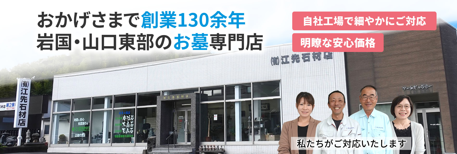 岩国・山口東部で墓石や石材のお仕事をさせていただいております、江先石材店です。どこにでもない、我が家のお墓造りをお手伝いいたします。岩国最大級の展示場には、和型石碑をはじめ、いろいろなデザイン墓をご用意しております。施工は当店のスタッフが行っており据付の経験は豊富です。細部まで責任をもって施工いたします。