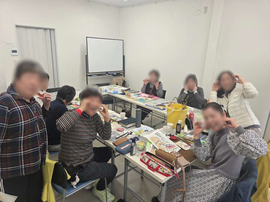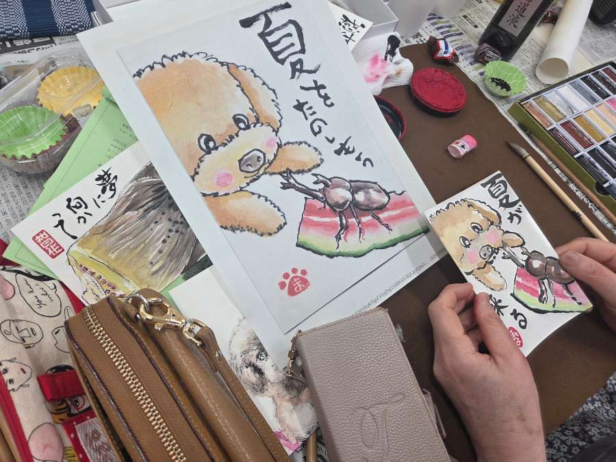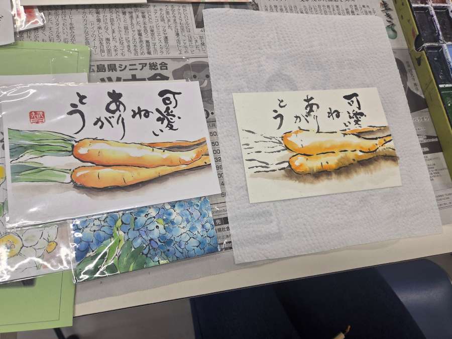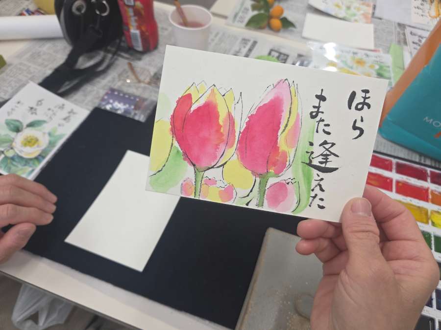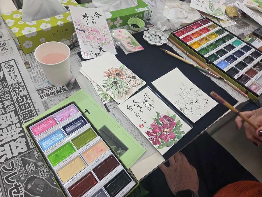 毎月第1水曜日、江先石材店のギャラリーで行われている絵手紙教室の様子です。
