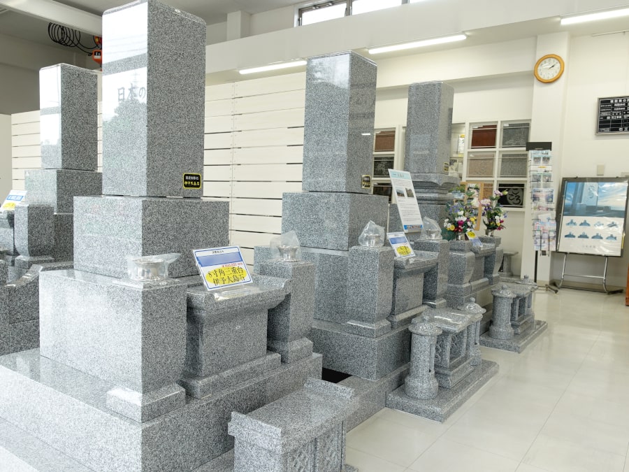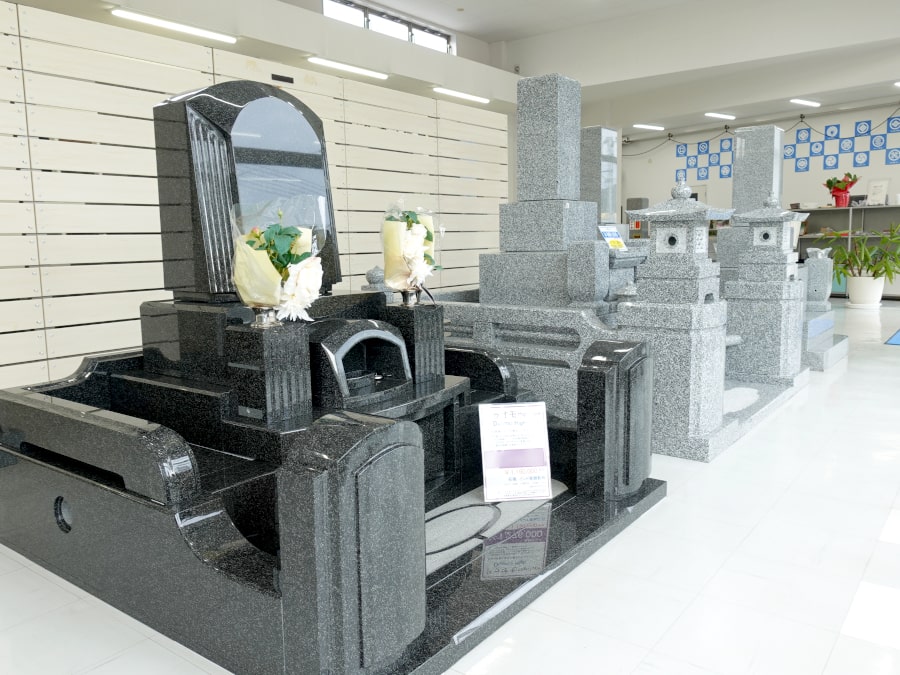 室内展示場には、たくさんのお墓が展示されています。