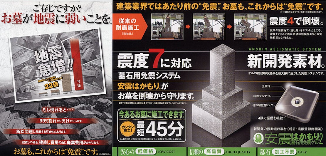 施工費用の大幅削減と、施工時間の短縮により、『安震はかもり』は低価格でのご提供を実現しました。また、低価格ということに加え、新規の建立だけでなく、今お持ちのお墓への施工が可能なため、災害に強い「安心のお墓」をよりたくさんの皆様へご提供することが可能となりました。