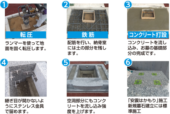 お墓の耐震施工をすることで、地震や災害の際に「お墓は大丈夫だろうか?倒れていないだろうか?」と心配する必要がなく、安心できます。当店で建立していないお墓でも設置可能です。どうぞお気軽にお問合せ下さい。