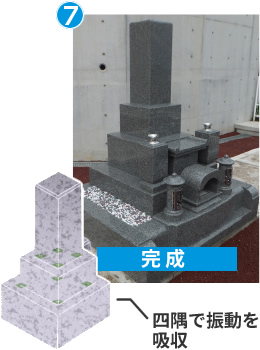 お墓は重たい石を積み上げたもの。地震の揺れは墓石の上部から下部へ伝わり、圧力の負荷もかかるため、地震吸収効果を墓石全体で確保する必要があります。『安震はかもり』では「金属球」と「特殊耐荷重リング」を挿入し、ゲルの効果をサポート。墓石全体をしっかり安定させることに成功しました。