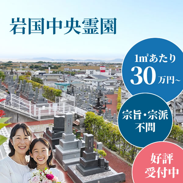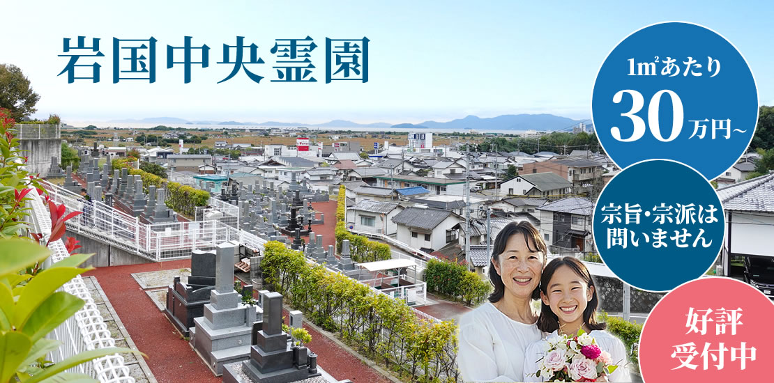 岩国中央霊園は、岩国市尾津町2丁目6−1にございます。JR山陽本線「南岩国駅」からお車で約4分でお越しいただけます。海を望める見晴らしの良さと、階段を電動で昇り降りできるリフトがあるバリアフリー設計で、どなたでも安心してお参りいただける霊園です。